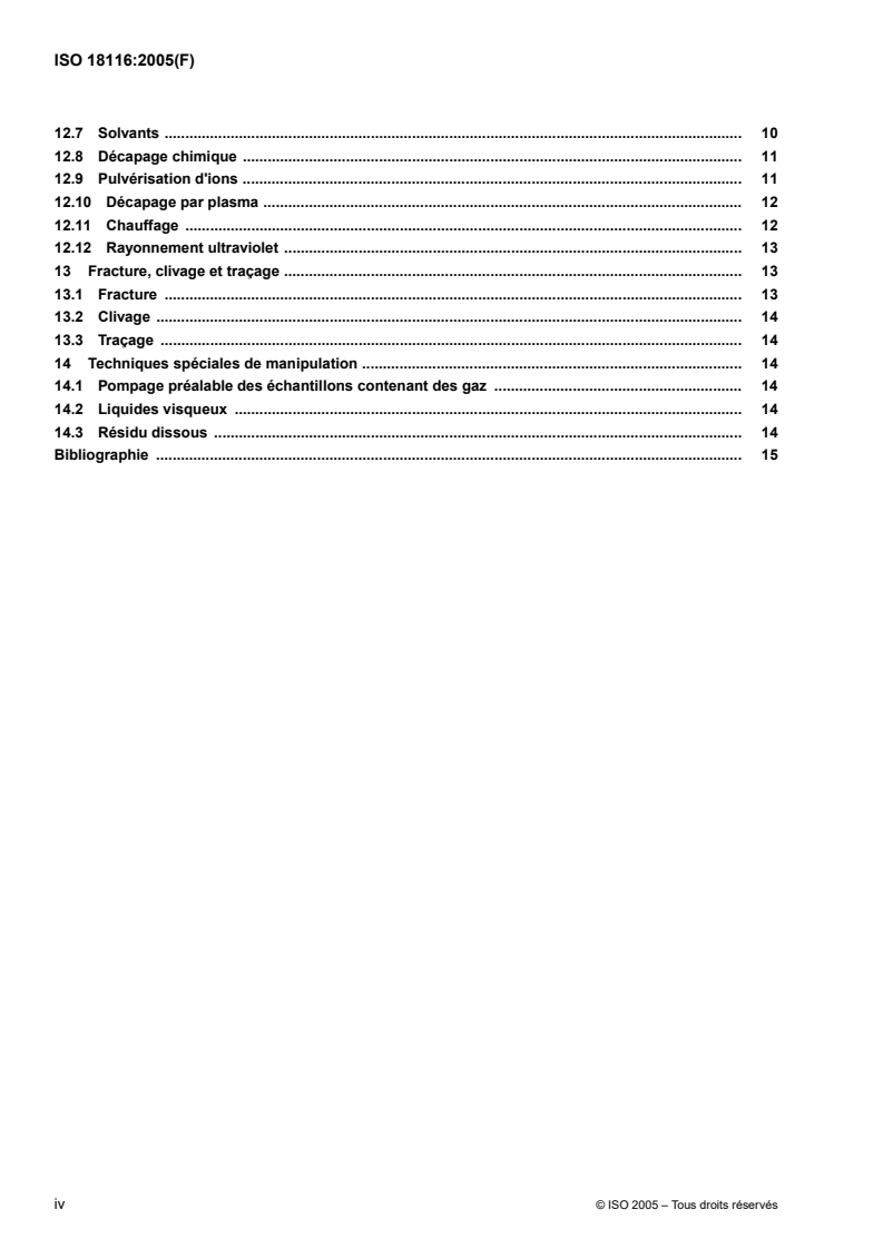 L'ISO 18116:2005 donne des indications sur les méthodes de montage et de traitement de surface pour un échantillon destiné à subir une analyse chimique des surfaces. Elle est destinée à l'analyste comme aide permettant de comprendre les conditions de manipulation spécialisées de l'échantillon nécessaires pour des analyses par des techniques telles que la spectroscopie des électrons Auger, la spectrométrie de masse des ions secondaires, et la spectroscopie de photoélectrons par rayons X.