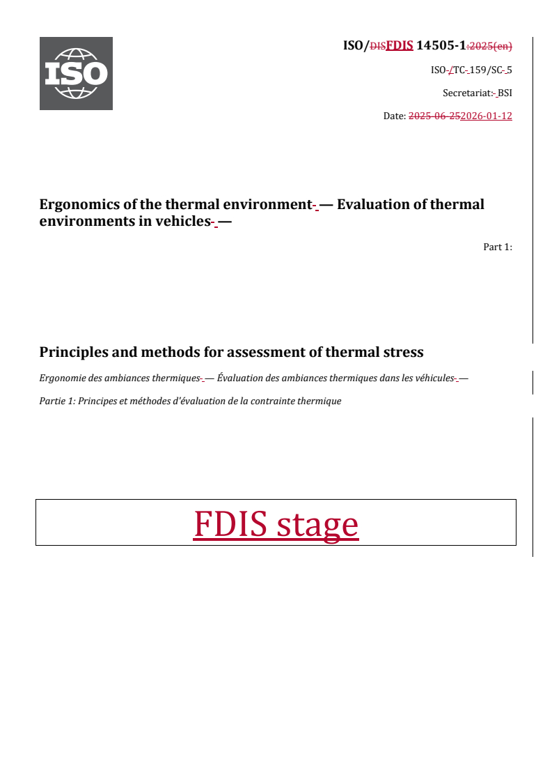 REDLINE ISO/FDIS 14505-1 - Ergonomics of the thermal environment — Evaluation of thermal environments in vehicles — Part 1: Principles and methods for assessment of thermal stress Released:12. 01. 2026