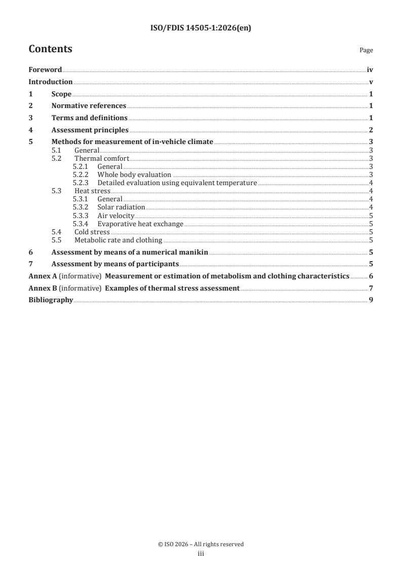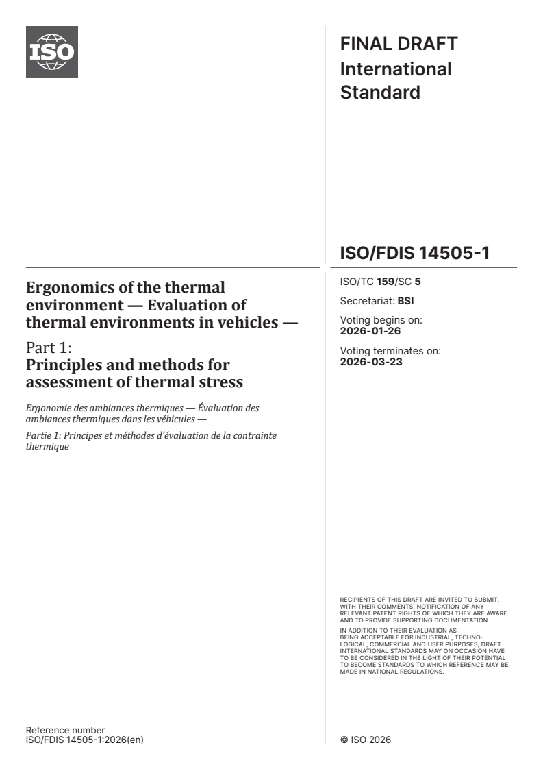 ISO/FDIS 14505-1 - Ergonomics of the thermal environment — Evaluation of thermal environments in vehicles — Part 1: Principles and methods for assessment of thermal stress Released:12. 01. 2026