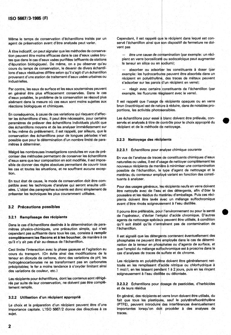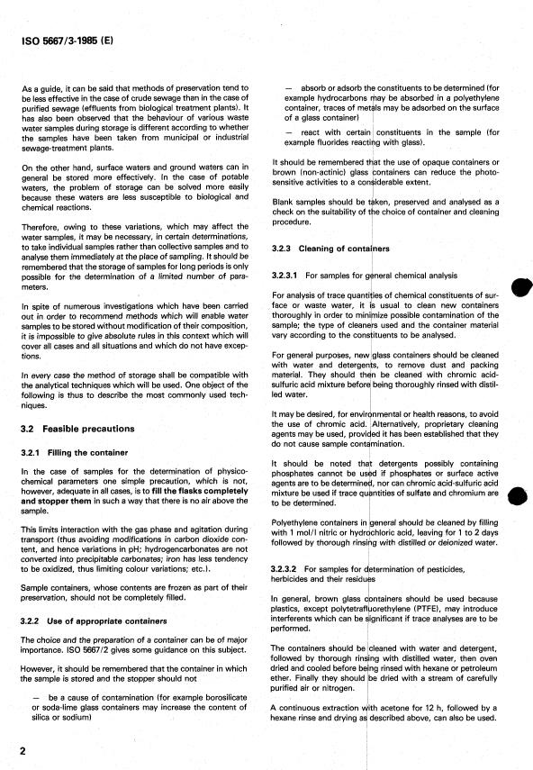 ISO 5667-3:1985 is a standard published by the International Organization for Standardization (ISO). Its full title is "Water quality — Sampling — Part 3: Guidance on the preservation and handling of samples". This standard covers: Water quality — Sampling — Part 3: Guidance on the preservation and handling of samples