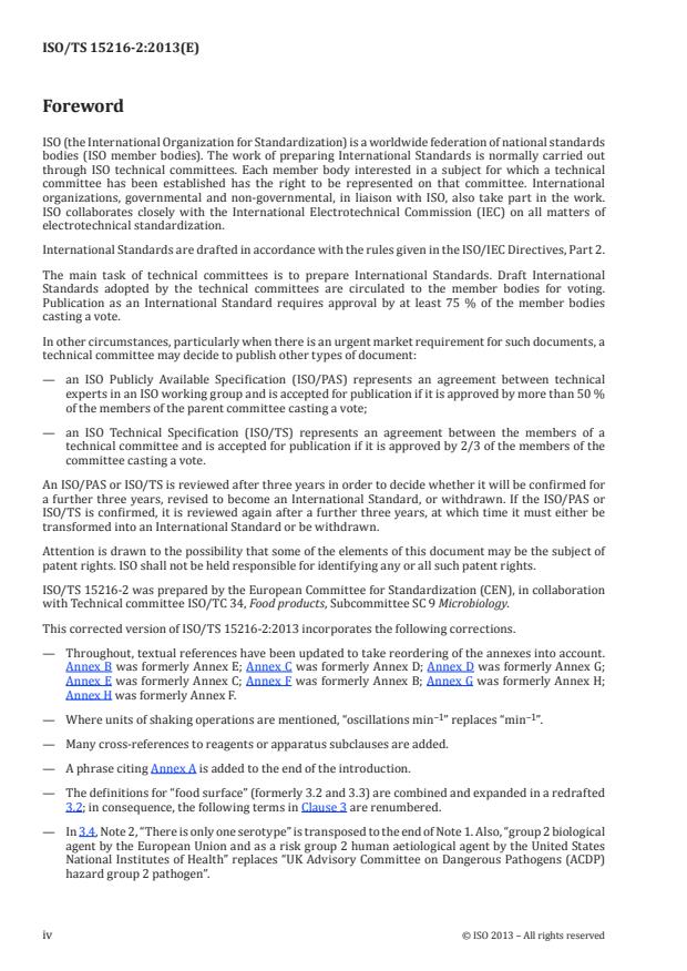 ISO/TS 15216-2:2013 is a technical specification published by the International Organization for Standardization (ISO). Its full title is "Microbiology of food and animal feed — Horizontal method for determination of hepatitis A virus and norovirus in food using real-time RT-PCR — Part 2: Method for qualitative detection". This standard covers: ISO/TS 15216-2:2013 describes a method for qualitative detection of HAV and NoV genogroups I (GI) and II (GII), from test samples of foodstuffs or food surfaces. Following liberation of viruses from the test sample, viral RNA is then extracted by lysis with guanidine thiocyanate and adsorption on silica. Target sequences within the viral RNA are amplified and detected by real-time RT-PCR. This approach is also relevant for detection of the target viruses on fomites, or of other human viruses in foodstuffs, on food surfaces or on fomites following appropriate validation and using target-specific primer and probe sets.