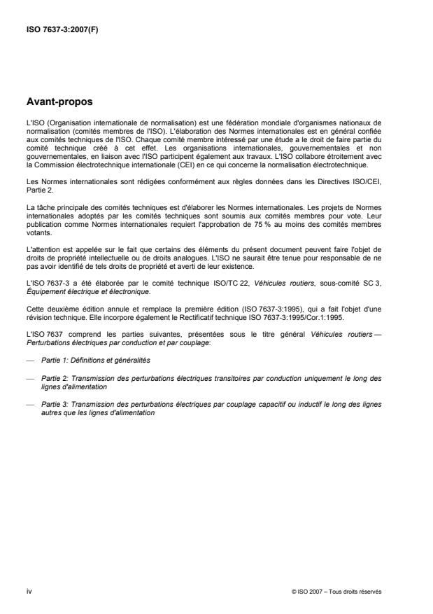 L'ISO 7637-3:2007 établit un banc d'essai pour l'évaluation de l'immunité des DSE aux transitoires transmis par couplage sur des lignes autres que celles d'alimentation. L'impulsion transitoire de l'essai simule aussi bien les perturbations transitoires rapides que lentes, telles que celles causées par la connexion des charges inductives et les rebonds au contact des relais. Trois méthodes sont décrites dans l'ISO 7637-3:2007: la méthode de la pince de couplage capacitive (PCC); la méthode du couplage capacitif direct (CCD); la méthode de la pince de couplage inductif (PCI). Il n'est nécessaire de choisir qu'une seule méthode pour les transitoires lents et qu'une seule méthode pour les transitoires rapides. L'ISO 7637-3:2007 s'applique aux véhicules routiers équipés de systèmes électriques dont la tension nominale de fonctionnement est de 12 V, 24 V ou 42 V. Pour l'immunité aux transitoires, des niveaux de sévérité d'essai recommandés, associés au principe de classification de l'état de performance de fonctionnement (CEPF) décrit dans l'ISO 7637-1, sont indiqués dans l'Annexe B.