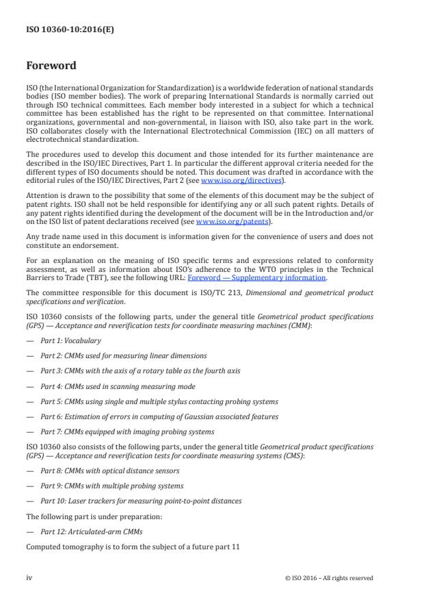 ISO 10360-10:2016 is a standard published by the International Organization for Standardization (ISO). Its full title is "Geometrical product specifications (GPS) — Acceptance and reverification tests for coordinate measuring systems (CMS) — Part 10: Laser trackers for measuring point-to-point distances". This standard covers: ISO 10360-10:2016 specifies the acceptance tests for verifying the performance of a laser tracker by measuring calibrated test lengths, test spheres and flats according to the specifications of the manufacturer. It also specifies the reverification tests that enable the user to periodically reverify the performance of the laser tracker. The acceptance and reverification tests given in this part of ISO 10360 are applicable only to laser trackers utilizing a retro-reflector as a probing system. Laser trackers that use interferometry (IFM), absolute distance meter (ADM) measurement, or both can be verified using this part of ISO 10360. This part of ISO 10360 can also be used to specify and verify the relevant performance tests of other spherical coordinate measurement systems that use cooperative targets, such as "laser radar" systems. NOTE Systems, such as laser radar systems, which do not track the target, will not be tested for probing performance. ISO 10360-10:2016 does not explicitly apply to measuring systems that do not use a spherical coordinate system (i.e. two orthogonal rotary axes having a common intersection point with a third linear axis in the radial direction). However, the parties can apply this part of ISO 10360 to such systems by mutual agreement. ISO 10360-10:2016 specifies - performance requirements that can be assigned by the manufacturer or the user of the laser tracker, - the manner of execution of the acceptance and reverification tests to demonstrate the stated requirements, - rules for proving conformance, and - applications for which the acceptance and reverification tests can be used.
