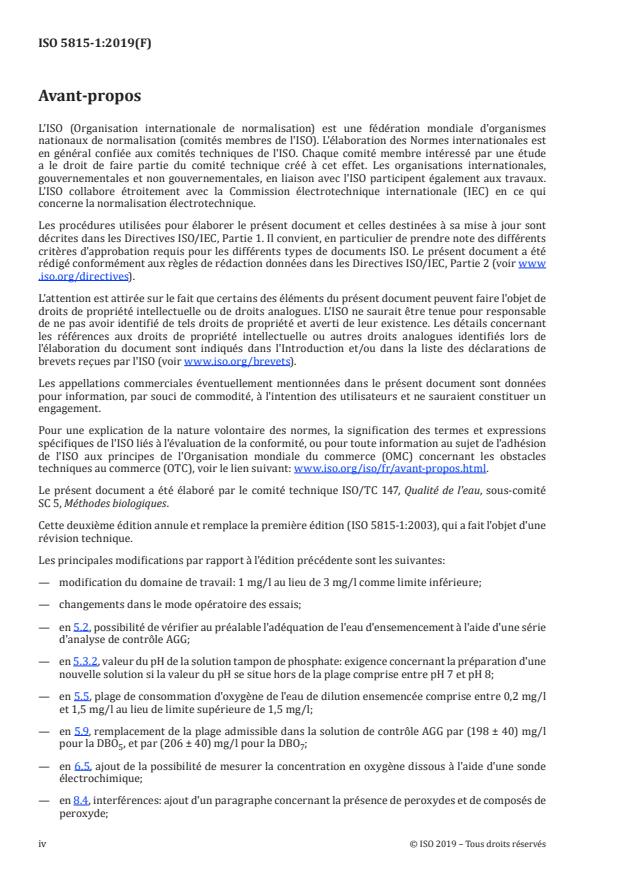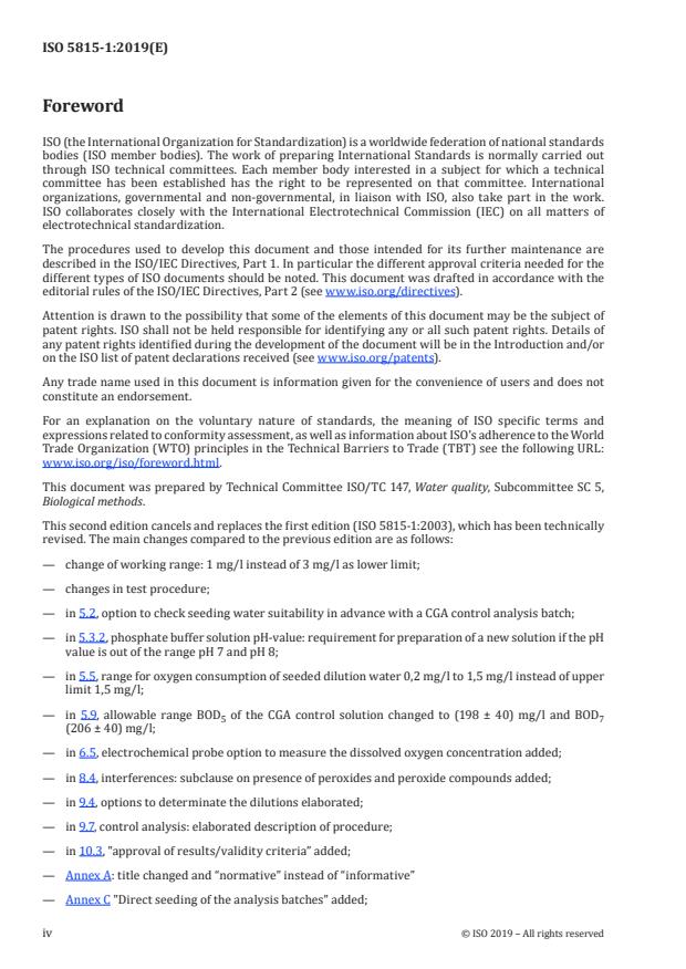 ISO 5815-1:2019 is a standard published by the International Organization for Standardization (ISO). Its full title is "Water quality - Determination of biochemical oxygen demand after n days (BODn) - Part 1: Dilution and seeding method with allylthiourea addition". This standard covers: This document specifies the determination of the biochemical oxygen demand of waters by dilution and seeding with suppression of nitrification after 5 d or 7 d incubation time. It is applicable to all waters having biochemical oxygen demands usually between 1 mg/l and 6 000 mg/l. It applies particularly to waste waters but also suits for the analysis of natural waters. For biochemical oxygen demands greater than 6 000 mg/l of oxygen, the method is still applicable, but special care is needed taking into consideration the representativeness of subsampling for preparation of the dilution steps. The results obtained are the product of a combination of biochemical and chemical reactions in presence of living matter which behaves only with occasional reproducibility. The results do not have the rigorous and unambiguous character of those resulting from, for example, a single, well‑defined, chemical process. Nevertheless, the results provide an indication from which the quality of waters can be estimated.