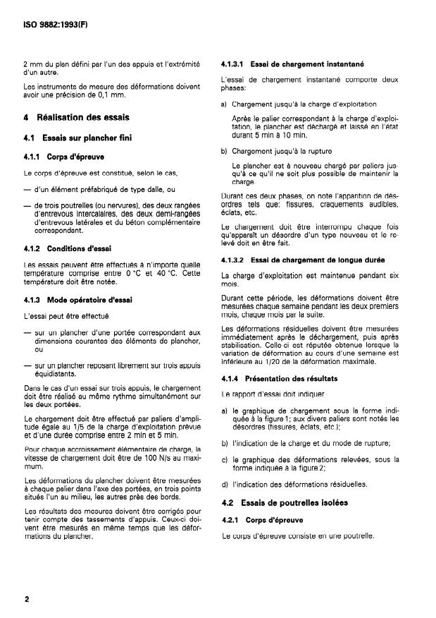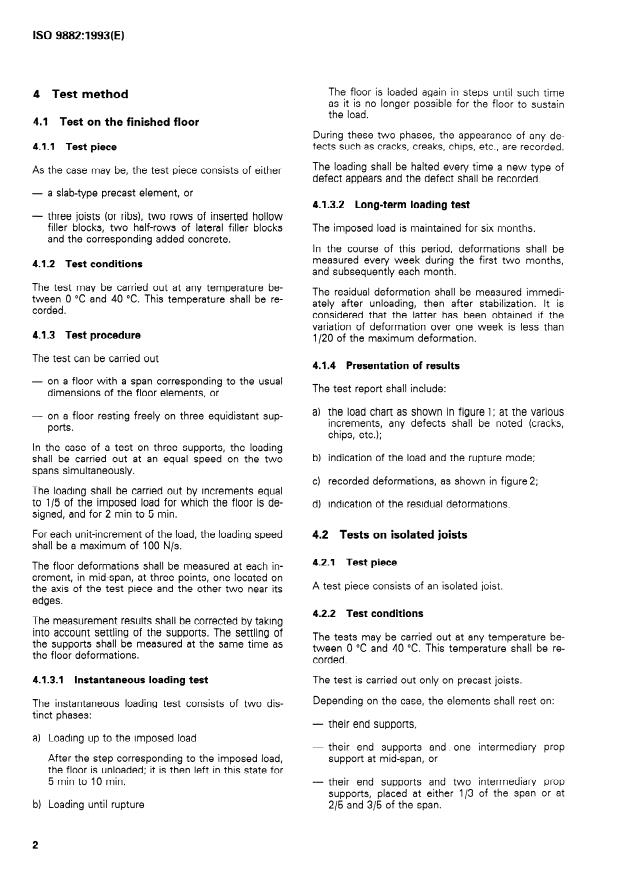 ISO 9882:1993 is a standard published by the International Organization for Standardization (ISO). Its full title is "Performance standards in building - Performance test for precast concrete floors - Behaviour under non-concentrated load". This standard covers: Defines test procedures for determining the mechanical performance of precast concrete floors made of a single piece, or made up of precast joists (reinforced concrete or precast concrete) completed with filler blocks and concrete poured in situ. The parameters measured are: the maximum load, which does not result in collapse, the instantaneous and deferred deformations under imposed load, and the maximum load which the floor or its constituent precast element can support without collapse during its construction. Applies to floors designed to support loads of less than 5000 N m^-2 and having spans of less than 12 m.