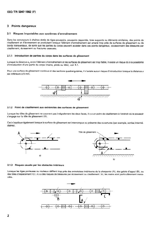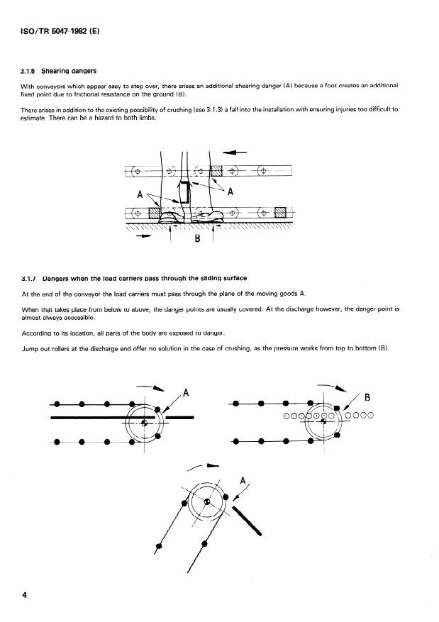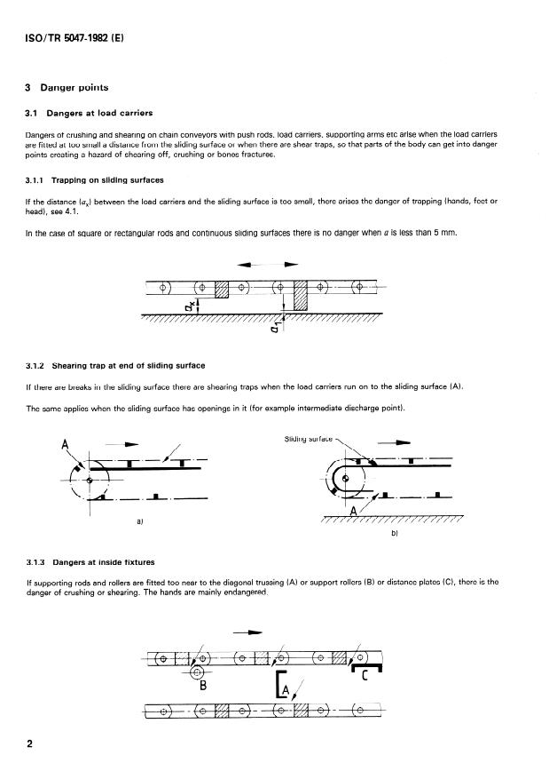 ISO/TR 5047:1982 is a technical report published by the International Organization for Standardization (ISO). Its full title is "Continuous mechanical handling equipment — Chain conveyors with bearing devices or load carriers — Examples of protection against injuries by load carriers". This standard covers: Gives examples of the various kinds of hazards connected with chain conveyors with supporting rods or rollers, push rods, single load carriers etc., suitable clearances as well as other safety measures and devices. Explains the various Standards for loose materials and unit loads. All remarks apply also to jointed apron conveyors especially in respect of external pressure edges, where crushing can take place.