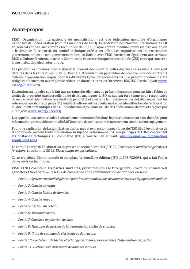 L'ISO 11783 dans son ensemble spécifie un réseau de données en série pour la commande et les communications sur les tracteurs forestiers ou agricoles et les équipements portés, semi‑portés, tractés ou automoteurs. Elle vise à normaliser la méthode et le format du transfert de données entre capteurs, actionneurs, dispositifs de commande, et unités de stockage et d'affichage de données, que ces éléments soient montés sur le tracteur ou qu'ils fassent partie du tracteur ou de tout autre outil. L'ISO 11783-7:2015 décrit la couche d'application de base, en spécifiant l'ensemble de messages et en définissant les messages utilisés pour la communication avec et entre les tracteurs et les outils reliés.