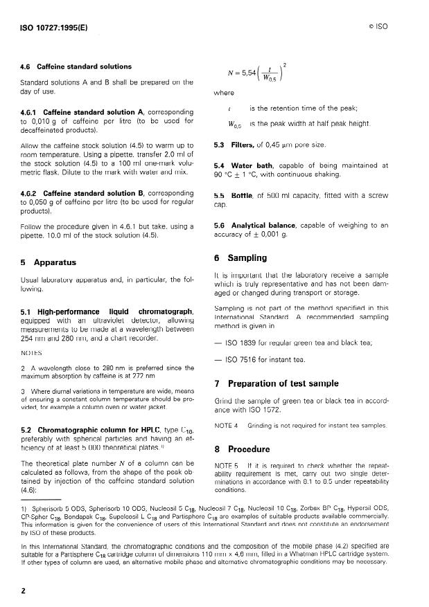 ISO 10727:1995 is a standard published by the International Organization for Standardization (ISO). Its full title is "Tea and instant tea in solid form — Determination of caffeine content — Method using high-performance liquid chromatography". This standard covers: The method specified is based on extracting the caffeine from a test portion with water at 90 °C in the presence of magnesium oxide, filtration followed by determination of the caffeine content by HPLC with UV detection. Applies to teas and instant teas with a caffeine content of greater than 0,3 % (m/m).