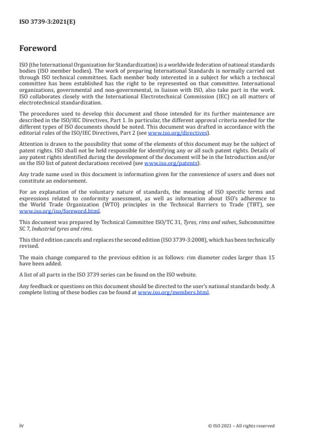 ISO 3739-3:2021 is a standard published by the International Organization for Standardization (ISO). Its full title is "Industrial tyres and rims — Part 3: Rims". This standard covers: This document specifies the main requirements, including size designation and marking, of 5-degree tapered and flat base rims primarily intended for industrial vehicles for use on prepared surfaces.