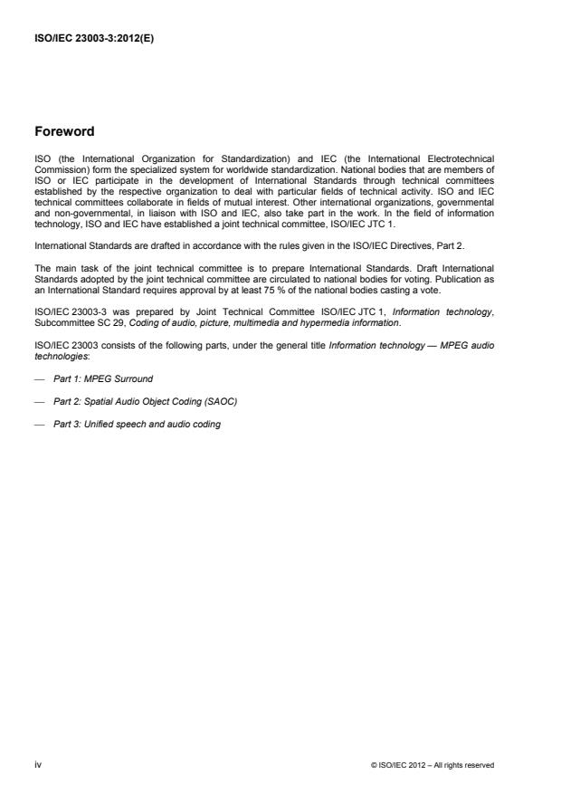 ISO/IEC 23003-3:2012 is a standard published by the International Organization for Standardization (ISO). Its full title is "Information technology - MPEG audio technologies - Part 3: Unified speech and audio coding". This standard covers: ISO/IEC 23003-3:2012 specifies a unified speech and audio codec which is capable of coding signals having an arbitrary mix of speech and audio content. The codec has a performance comparable to or better than the best known coding technology that might be tailored specifically to coding of either speech or general audio content. The codec supports single and multi-channel coding at high bitrates and provides perceptually transparent quality. At the same time, it enables very efficient coding at very low bitrates while retaining the full audio bandwidth. ISO/IEC 23003-3:2012 incorporates several perceptually-based compression techniques developed in previous MPEG standards: perceptually shaped quantization noise, parametric coding of the upper spectrum region and parametric coding of the stereo sound stage. However, it combines these well-known perceptual techniques with a source coding technique: a model of sound production, specifically that of human speech.