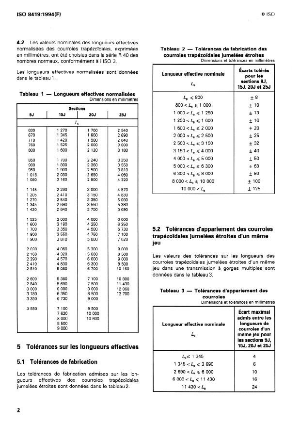 La présente Norme internationale prescrit pour les courroies trapézoïdales jumelées étroites de sections 9J (pour gorges de poulies de 8,9 mm de largeur effective), 15J (pour gorges de poulies de 15,2 mm de largeur effective), 20J (pour gorges de poulies de 20,9 mm de largeur effective), 25J (pour gorges de poulies de 25,4 mm de largeur effective) : -- les longueurs effectives recommandées ; -- les tolérances sur les longueurs effectives ; -- les variations d'entraxe ; -- les conditions de contrôle de la longueur effective et de la variation d'entraxe. NOTE 1 La section d'une courroie trapézoïdale jumelée étroite est définie par un nombre (9, 15, 20 ou 25) suivi de la lettre J.