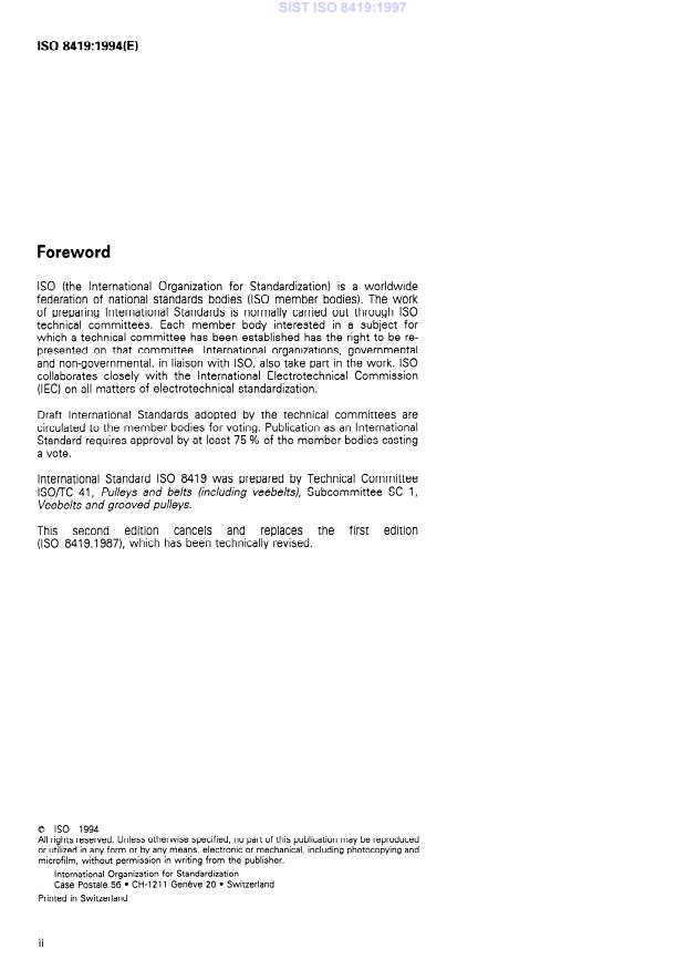ISO 8419:1994 is a standard published by the International Organization for Standardization (ISO). Its full title is "Belt drives — Narrow joined V-belts — Lengths in effective system". This standard covers: Specifies for V-belts of cross-sections: 9J (effective width 8,9 mm), 15J (effective width 15,2 mm), 20J (effective width 20,9 mm), 25J (effective width 25,4 mm), the recommended effective lengths and their tolerances, and the conditions for measuring the effective length.