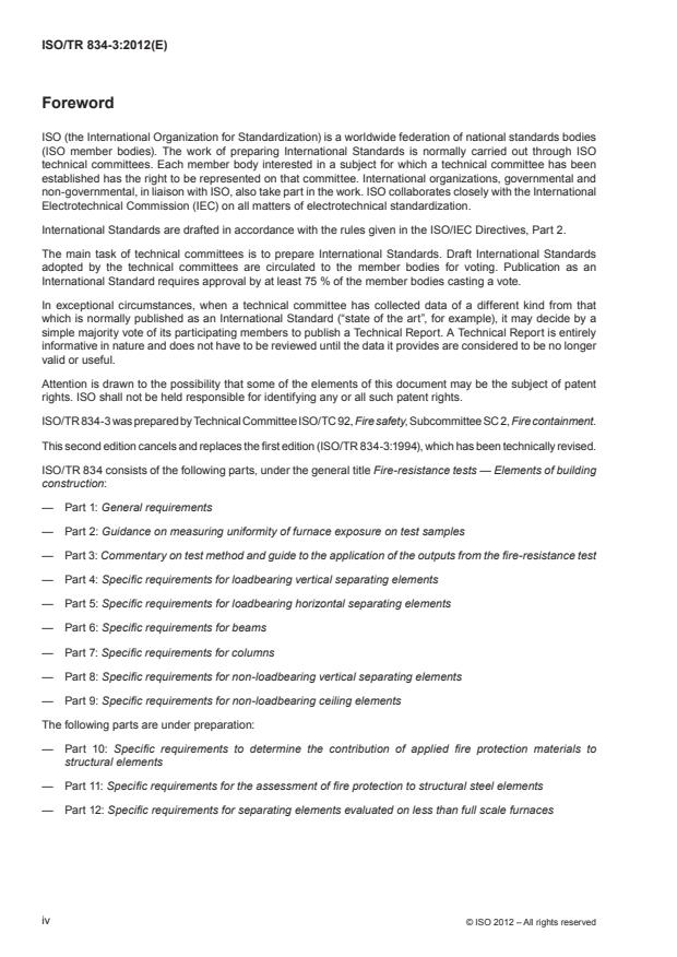 ISO/TR 834-3 clarifies the technical context and practical implications of the test procedure rather than adding new mandatory test requirements. Major topics covered include: