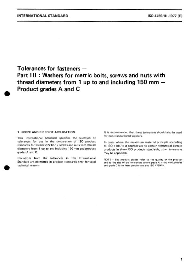 ISO 4759-3:1977 is a standard published by the International Organization for Standardization (ISO). Its full title is "Tolerances for fasteners — Part 3: Washers for metric bolts, screws and nuts with thread diameters from 1 up to and including 150 mm — Product grades A and C". This standard covers: Tolerances for fasteners — Part 3: Washers for metric bolts, screws and nuts with thread diameters from 1 up to and including 150 mm — Product grades A and C