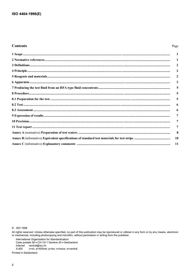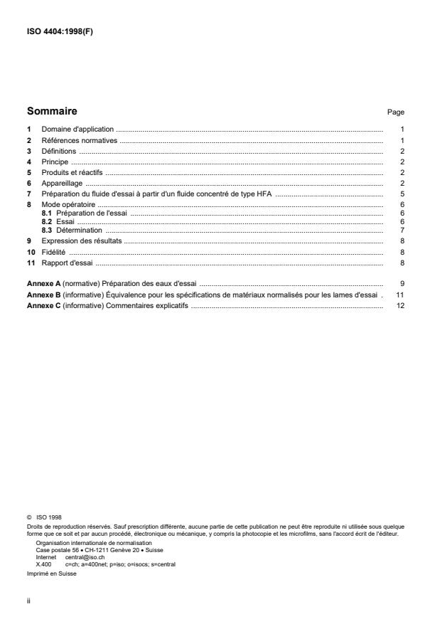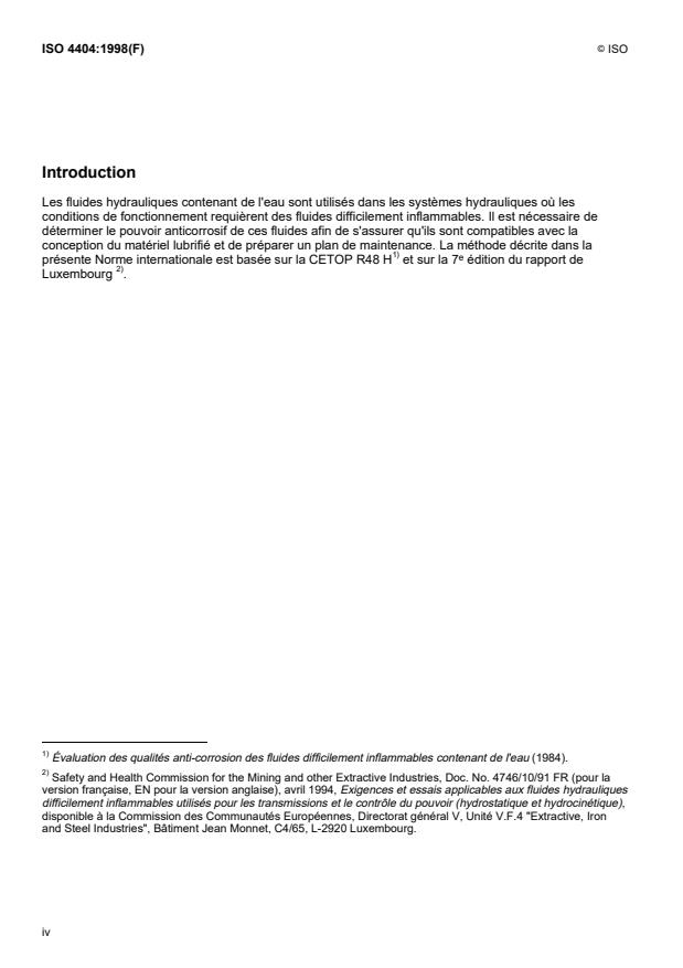 ISO 4404:1998 is a standard published by the International Organization for Standardization (ISO). Its full title is "Petroleum and related products — Determination of the corrosion resistance of water-containing fire-resistant fluids for hydraulic systems". This standard covers: La présente Norme internationale prescrit une méthode d'essai qui a pour but de déterminer les effets produits sur les métaux par les fluides des catégories HFA, HFB et HFC, selon la classification de l'ISO 6743-4. Elle permet d'évaluer le pouvoir anticorrosif de ces fluides envers les éléments métalliques utilisés dans les systèmes et les installations hydrauliques.