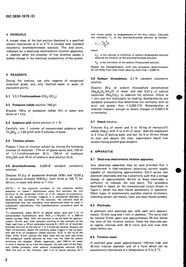 ISO 3839:1978 is a standard published by the International Organization for Standardization (ISO). Its full title is "Petroleum distillates and commercial aliphatic olefins — Determination of bromine number — Electrometric method". This standard covers: Petroleum distillates and commercial aliphatic olefins — Determination of bromine number — Electrometric method