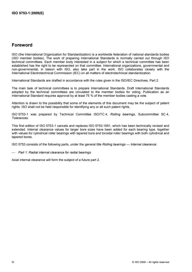 ISO 5753-1:2009 is a standard published by the International Organization for Standardization (ISO). Its full title is "Rolling bearings - Internal clearance - Part 1: Radial internal clearance for radial bearings". This standard covers: ISO 5753-1:2009 specifies values of radial internal clearance for: - radial contact groove ball bearings, except those for insert bearings; - double-row self-aligning ball bearings; - cylindrical roller bearings; - needle roller bearings, except drawn cup needle roller bearings; - toroidal roller bearings; - double-row self-aligning roller bearings. It gives clearance values for all six types of bearing with cylindrical bore and also for double-row self-aligning ball bearings, cylindrical roller bearings, toroidal roller bearings and double-row self-aligning roller bearings with tapered bore.