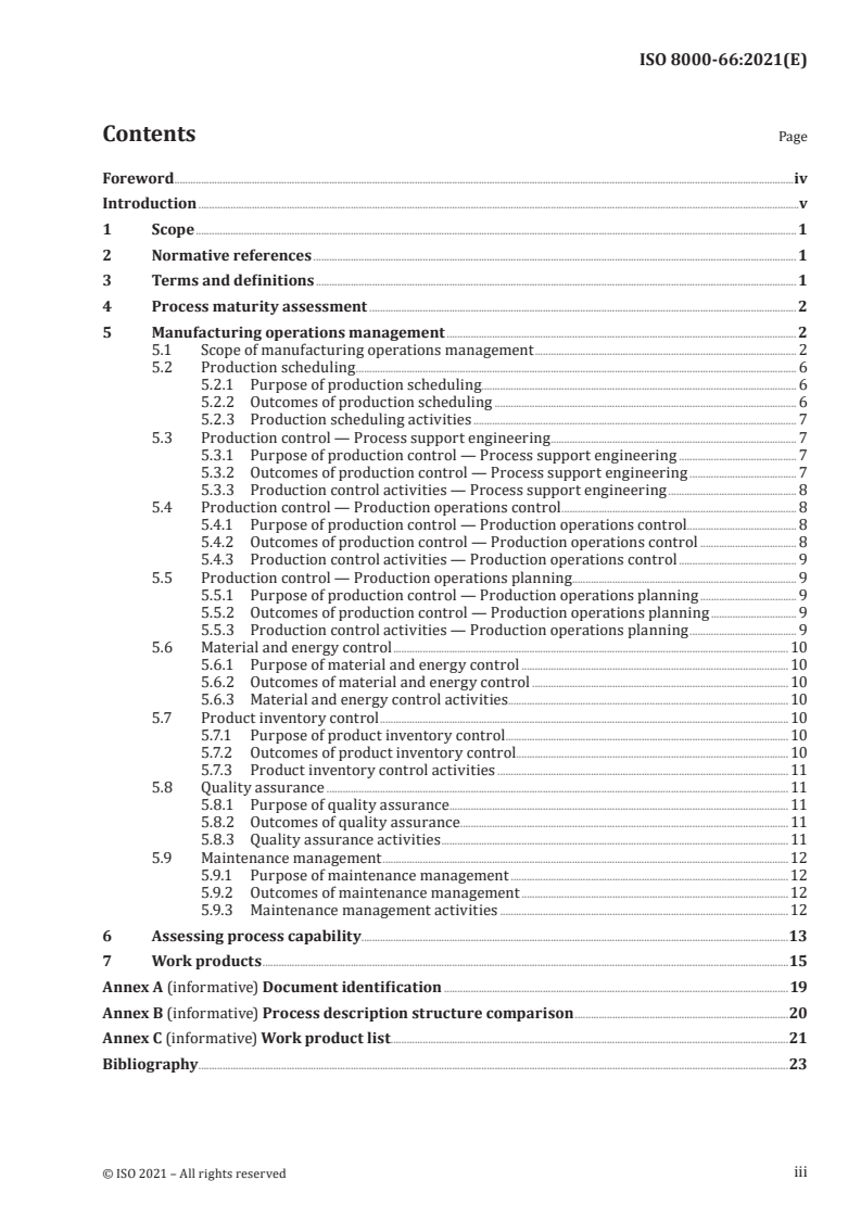 ISO 8000-66:2021 is a standard published by the International Organization for Standardization (ISO). Its full title is "Data quality — Part 66: Data quality management: Assessment indicators for data processing in manufacturing operations". This standard covers: This document specifies assessment indicators to support the assessment of organizational process maturity for data quality management in the context of manufacturing operations management as specified by IEC 62264‑1. The following are within scope of this document: — assessment indicators that are work products generated by data processing (as specified by ISO 8000‑61) and, thus, enable rating of process performance, a process attribute specified by ISO/IEC 33020; — the role played by each work product in the processes of manufacturing operations management; — the connection of each work product to the outcomes of the processes of manufacturing operations management. The following are outside the scope of this document: — assessment indicators for any of the other process attributes specified by ISO/IEC 33020; — methods or procedures to measure process capability.