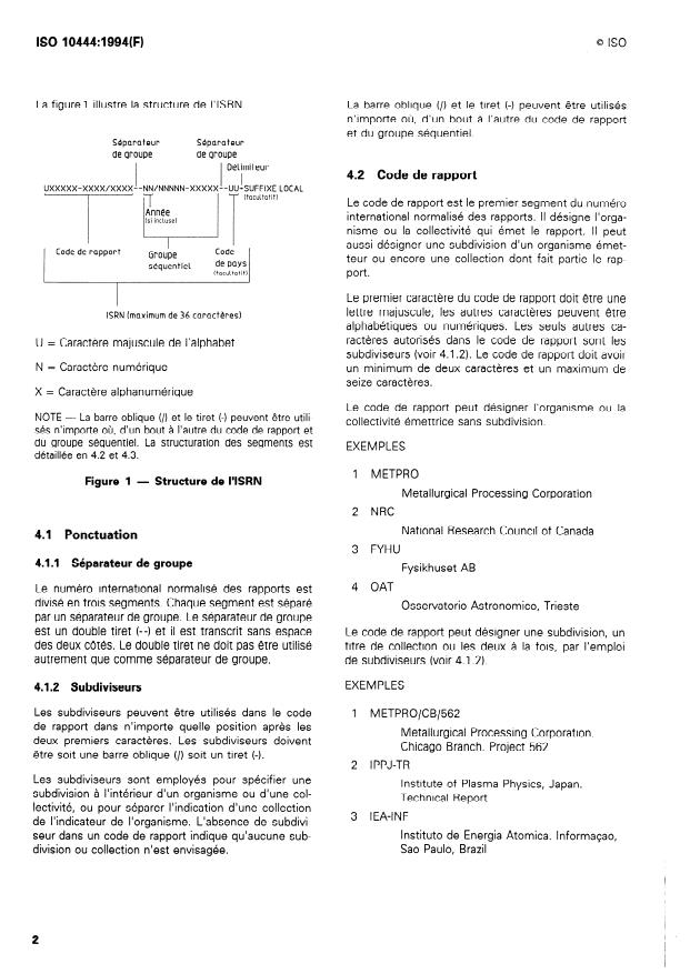 INTERNATIONAL STANDARD 0 ISO ISO 10444:1994(E) Information and documentation - International Standard technical report number (ISRN) 1 Scope This International Standard defines and promotes the use of a Standard number (ISRN) for the unique iden- tification of technical reports. The international Standard technical report number (ISRN) specifies a uniform format for the creation of unique, but compatible, numbers used for the iden- tification, organization and location of technical re- ports. This International Standard is applicable to both pub- licly distributed and in-house technical reports includ- ing those produced in non-print media. 2 Normative references The following Standards contain provisions which, through reference in this text, constitute provisions of this International Standard. At the time of publi- cation, the editions indicated were valid. All Standards are subject to revision, and Parties to agreements based on this International Standard are encouraged to investigate the possibility of applying the most re- cent editions of the Standards indicated below. Members of IEC and ISO maintain registers of cur- rently valid International Standards. ISO 3166:1993, Codes for the representation of names of countries. ISO 5966:1982, Documentation - Presentation of seien tific and technical reports. 3 Definitions For the purposes of this International Standard, the following definitions apply. 3.1 international Standard technical report num- ber (ERN): Alphanumeric identifier containing a maximum of 36 characters which, when printed or written, is preceded by the letters ISRN; the inter- national Standard technical report number serves to uniquely identify a Single technical report. 3.2 technical report: Document that describes the results of research, investigations or other studies and which is initially submitted to the person or corporate body for which the investigation was carried out or by which it was sponsored. NOTE 1 A technical report tan be on any subject. Technical reports are not usually produced commercially and are not normally available through commercial booksellers. Technical reports are usually issued irregularly, either as part of a series or as separate monographs. 4 Construction of an international Standard technical report number Whenever an international Standard technical report number is written or printed, the Ietters ISRN shall precede it and shall be separated from it by a space. An ISRN consists of a maximum of 36 alphanumeric charactersl) which shall be digits (Arabic numerals 0 to 9), uppercase letters of the Latin alphabet and a defined set of Symbols. lt is divided into three seg- ments and, in addition, an optional local suffix may be appended but it does not form part of the ISRN. Figure 1 illustrates the structure of the ISRN. 1) These 36 characters include each diagonal slash and hyphen in an international Standard technical report number but do not include the letters ISRN which precede it. SIST ISO 10444:1996