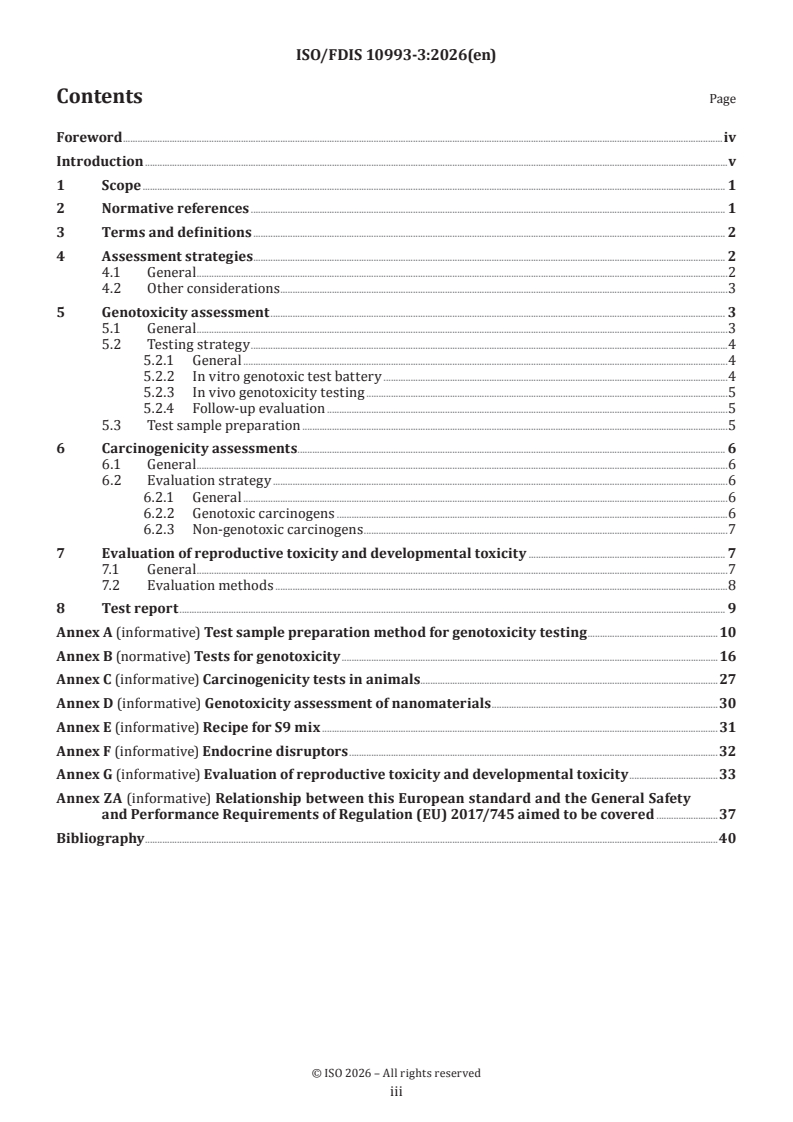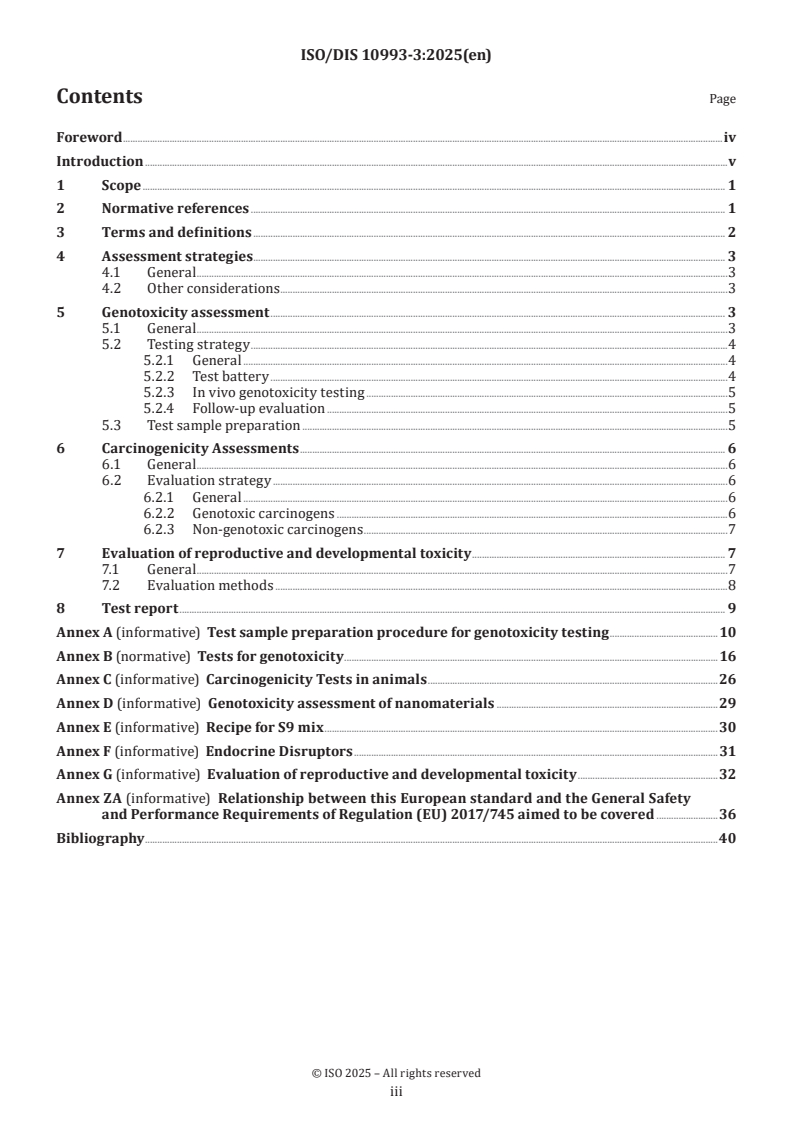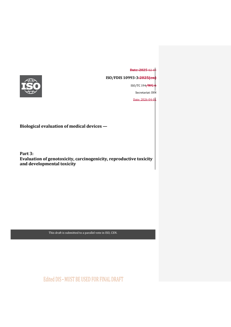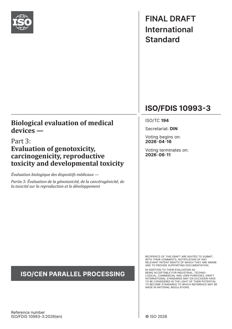 ISO/FDIS 10993-3 - Biological evaluation of medical devices — Part 3: Evaluation of genotoxicity, carcinogenicity, reproductive toxicity and developmental toxicity/7/2025