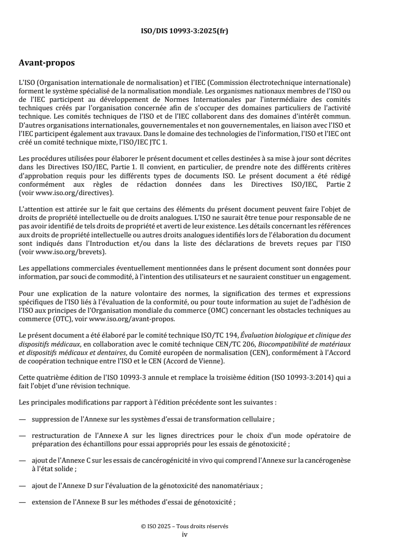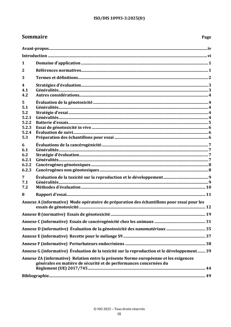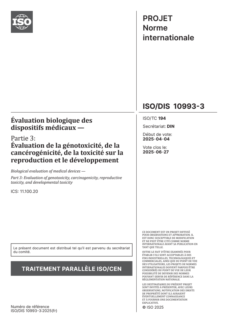ISO/FDIS 10993-3 - Évaluation biologique des dispositifs médicaux — Partie 3: Évaluation de la génotoxicité, de la cancérogénicité, de la toxicité sur la reproduction et le développement/8/2025