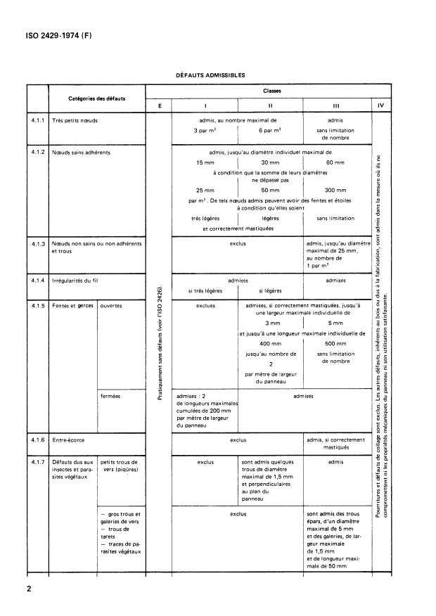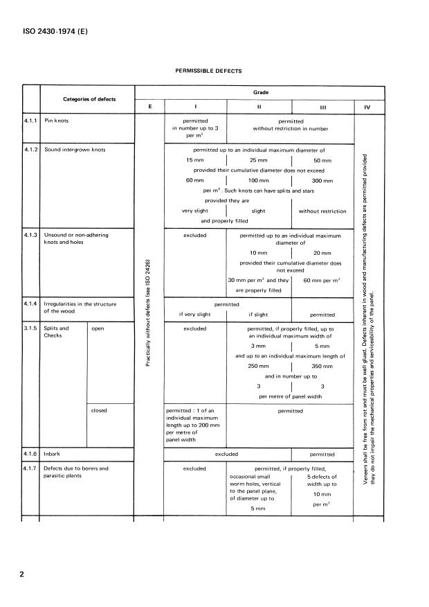 Surfaces are classified in one of the grades E, I, II, III, and IV in accordance with ISO 2426 as defined by the permissible defects indicated in the table. The terms used are defined in ISO 2074. A list of the broadleaved species of Tropical Africa used for this purpose is given in the Annex.
