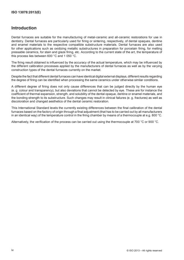 ISO 13078:2013 is a standard published by the International Organization for Standardization (ISO). Its full title is "Dentistry — Dental furnace — Test method for temperature measurement with separate thermocouple". This standard covers: ISO 13078:2013 specifies a test method for the calibration of dental furnaces that are suitable for the heat treatment of silica-based dental ceramic restorations in the temperature range between 600 °C and 1 050 °C.