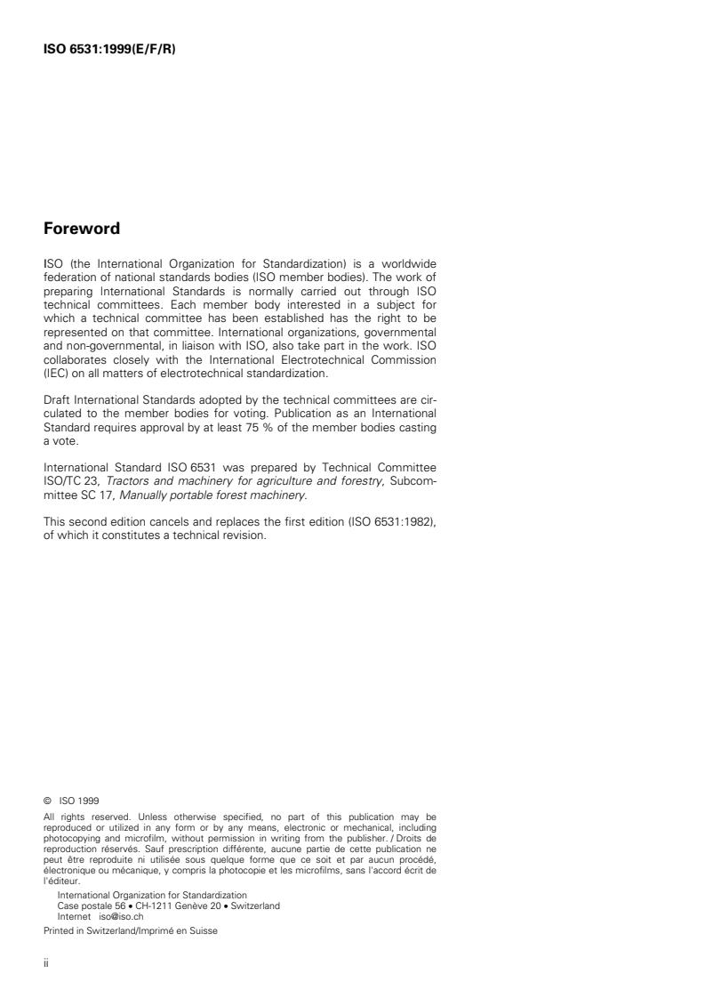 ISO 6531:1999 is a standard published by the International Organization for Standardization (ISO). Its full title is "Machinery for forestry — Portable hand-held chain-saws — Vocabulary". This standard covers: La présente Norme internationale définit les termes relatifs aux as- pects mécaniques des scies à chaînes portatives, des chaînes et des guide-chaînes. Elle ne traite pas des données techniques, lesquelles sont couvertes par l'ISO 6532.1)
