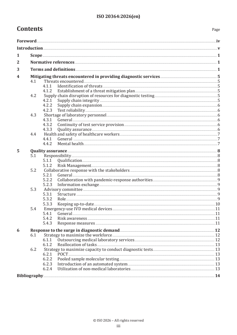 ISO 20364:2026 is a standard published by the International Organization for Standardization (ISO). Its full title is "Healthcare organization management — Pandemic response — Requirements for surging diagnostic demand". This standard covers: This document outlines requirements for healthcare organizations to deliver diagnostic tests timely and accurately in a pandemic by leveraging innovative approaches to overcome the limitations of laboratory capacity as follows: mitigation of threats encountered in providing diagnostic services during a pandemic; consideration for quality assurance of diagnostic service provision in a pandemic context; possible response measures to the surge in diagnostic demand. This document does not cover the specific procedures involved in providing pandemic-response medical tests, such as the specimen collection protocols in the specimen collection units or screening stations (e.g. walk-through or drive-through), experimental procedures and the quality management systems of medical laboratories. Furthermore, this document does not address the pandemic responses related to the medical treatment of infected patients in care units (e.g. emergency unit and in-patient unit) and the transferring of confirmed patients within the healthcare organization during a pandemic.