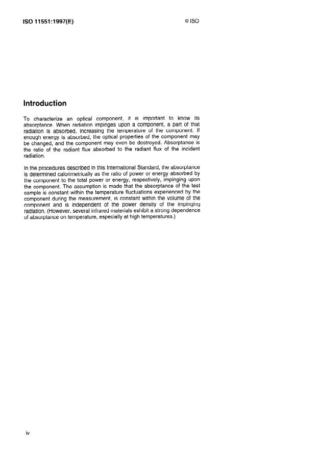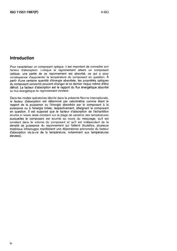 ISO 11551:1997 is a standard published by the International Organization for Standardization (ISO). Its full title is "Optics and optical instruments — Lasers and laser-related equipment — Test method for absorptance of optical laser components". This standard covers: La présente Norme internationale prescrit les modes opératoires et techniques utilisés pour obtenir des valeurs comparables du facteur d'absorption des composants optiques pour lasers.