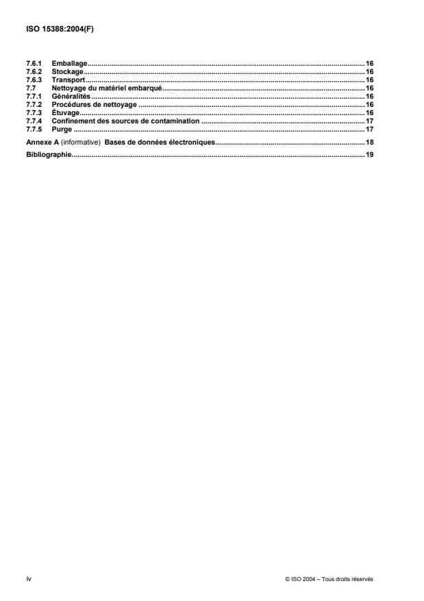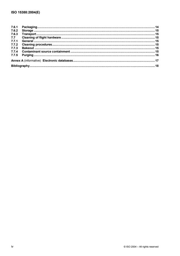 L'ISO 15388:2004 définit les exigences générales relatives au contrôle de la contamination et de la propreté, applicables à tous les fournisseurs participant au développement des systèmes spatiaux, comprenant les installations de traitement, les équipements de support au sol, les lanceurs spatiaux, les véhicules spatiaux, les charges utiles, les procédés au sol et les opérations en orbite. Elle donne également quelques lignes directrices permettant d'établir un programme de contrôle de la contamination et de la propreté.