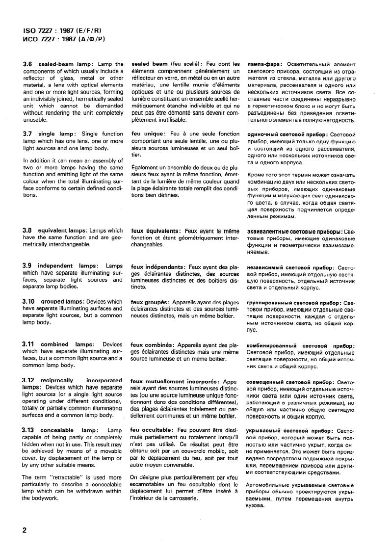 ISO 7227:1987 is a standard published by the International Organization for Standardization (ISO). Its full title is "Road vehicles — Lighting and light signalling devices — Vocabulary". This standard covers: Defines terms in the three ISO-languages English, French, and Russian relating to lighting and light signalling devices for road vehicles as defined in ISO 3833 (in certain countries and international bodies, the term "light" is sometimes used instead of "lamp"). Alphabetical indexes in English, French, and Russian are also included.