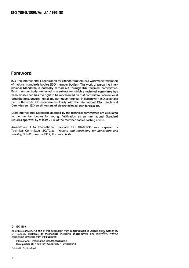 ISO 789-9:1990/Amd 1:1993 is a standard published by the International Organization for Standardization (ISO). Its full title is "Agricultural tractors — Test procedures — Part 9: Power tests for drawbar — Amendment 1". This standard covers: Amends the first paragraph of subclause 6.3.