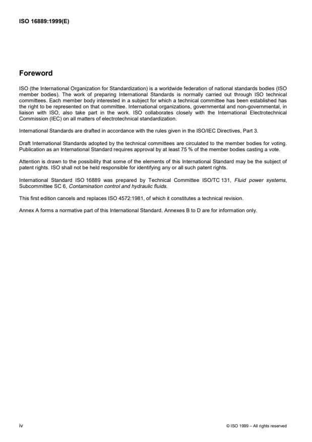 ISO 16889:1999 - Filtres pour transmissions hydrauliques -- Évaluation des performances par la méthode de filtration en circuit fermé