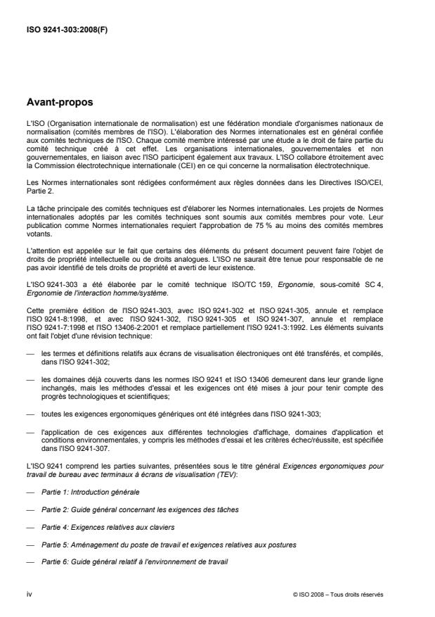 L'ISO 9241-303:2008 établit des exigences de qualité d'image, et donne des lignes directrices, pour les écrans de visualisation électroniques. Ces exigences et lignes directrices sont génériques — elles sont indépendantes de la technologie, de la tâche et de l'environnement. Elles sont énoncées sous forme de spécifications et de recommandations de performance pour garantir des conditions de visualisation efficaces et confortables aux utilisateurs disposant d'une vision normale ou ajustée de manière à être normale. L'ISO 9241-303:2008 n'aborde pas les questions d'accessibilité des personnes handicapées, mais tient compte des considérations liées à la vue des personnes âgées, et peut être utile pour les personnes qui, dans certains cas, présentent une insuffisance visuelle: la spécification des caractéristiques essentielles de la vision normale peut être utilisée pour évaluer la gravité de différentes anomalies visuelles, afin de pouvoir identifier des solutions appropriées.