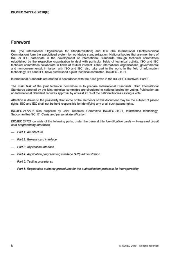 ISO/IEC 24727-6:2010 is a standard published by the International Organization for Standardization (ISO). Its full title is "Identification cards - Integrated circuit card programming interfaces - Part 6: Registration authority procedures for the authentication protocols for interoperability". This standard covers: ISO/IEC 24727-6:2010 defines the procedures for registration of authentication protocols (APs), including related cryptographic algorithms, test methods and conformance assessment criteria, and registration of the adoption of ISO/IEC 24727 APs by parties desiring to advertise AP interoperability.