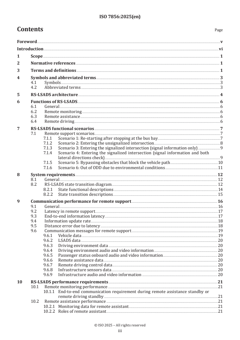ISO 7856:2025 is a standard published by the International Organization for Standardization (ISO). Its full title is "Intelligent transport systems - Remote support for low speed automated driving systems (RS-LSADS) - Performance requirements, system requirements and performance test procedures". This standard covers: This document describes remote support provided to LSADS operated at Level 4 automation on predefined routes by a remotely located human in order to facilitate safe trip continuation. "Remote support" refers to the provision of information, or temporary performance of the dynamic driving task (DDT), and remote monitoring required for these functions. This document is applicable to RS-LSADS in vehicles that provide passenger transport or logistics services on predefined routes. This document specifies: - the terms and definitions related to RS-LSADS and the system architecture of RS-LSADS; - functions of RS-LSADS, which are: remote monitoring, remote assistance and remote driving that is operated under very limited conditions, and conditions under which they need to be activated; - the performance requirements, system requirements and performance test procedures of RS-LSADS; - the data to be communicated between vehicles and the remote support facility (but not protocols or other aspects of communication system). This document is applicable to remote support of operational and tactical functions during continuous operations, but does not apply to strategic functions or to RS-LSADS daily startup or shutdown.