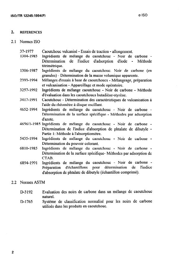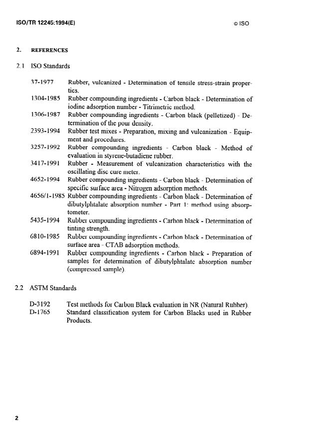 ISO/TR 12245:1994 is a technical report published by the International Organization for Standardization (ISO). Its full title is "Carbon blacks used in rubber products — Classification system". This standard covers: The system is used to classify rubber grade carbon blacks by the use of a four-character nomenclature system. The first character gives some indication of the influence of the carbon black on the rate of cure of a typical rubber compound containing the black, the second character gives information on the average particle size of the carbon black, and the last two characters are assigned arbitrarily. All rubber grade carbon blacks for which a number is currently assigned at the time of publication of this classification system are listed in two tables. Assignment of a number is exclusively the ASTM D-24 Committee's responsibility.