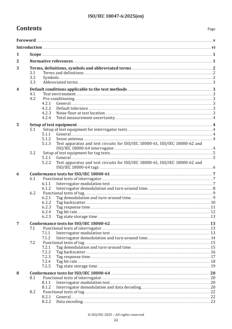 ISO/IEC 18047-6:2025 is a standard published by the International Organization for Standardization (ISO). Its full title is "Information technology - Radio frequency identification device conformance test methods - Part 6: Test methods for air interface communications at 860 MHz to 930 MHz". This standard covers: This document specifies test methods for determining the conformance of radio frequency identification (RFID) devices (tags and interrogators) for item management with the specifications given in ISO/IEC 18000-61, ISO/IEC 18000-62 and ISO/IEC 18000-64. However, this document does not apply to the testing of conformance with regulatory or similar requirements. The test methods require only that the mandatory functions, and any optional functions which are implemented, are verified. This can, in appropriate circumstances, be supplemented by further, application-specific functionality criteria that are not available in the general case. The interrogator and tag conformance parameters in this document are the following: - type-specific conformance parameters including nominal values and tolerances; - parameters that apply directly affecting system functionality and inter-operability. Parameters that are already included in regulatory test requirements are not included in this document. Unless otherwise specified, the tests in this document are intended to be applied exclusively to RFID tags and interrogators defined in ISO/IEC 18000-61, ISO/IEC 18000-62 and ISO/IEC 18000-64.