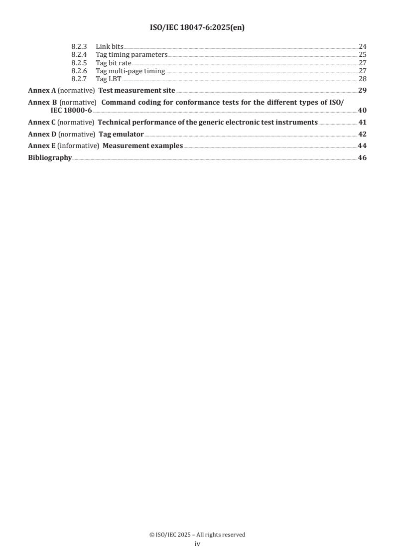 - Measurement infrastructure: normative annexes cover test measurement site requirements, command coding, technical performance of test instruments, tag emulator specifications and example measurements.