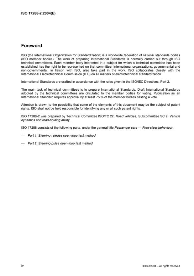 ISO 17288-2:2004 is a standard published by the International Organization for Standardization (ISO). Its full title is "Passenger cars — Free-steer behaviour — Part 2: Steering-pulse open-loop test method". This standard covers: ISO 17288-2:2004 specifies a procedure for determining the free control stability of a passenger car as defined in ISO 3833, by measurement of the transient behaviour following steering pulse input, starting from a straight-ahead, steady-state status.