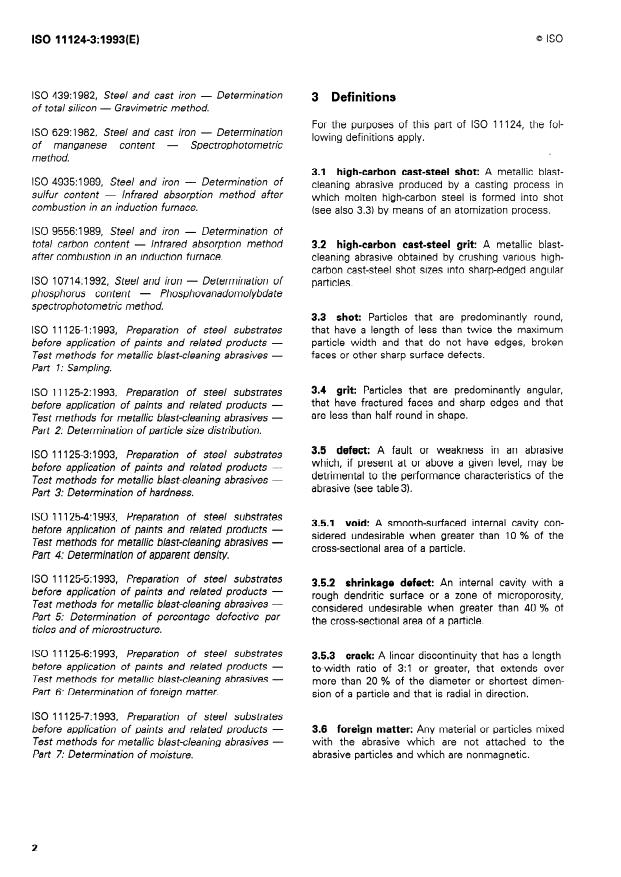 ISO 11124-3:1993 is a standard published by the International Organization for Standardization (ISO). Its full title is "Preparation of steel substrates before application of paints and related products — Specifications for metallic blast-cleaning abrasives — Part 3: High-carbon cast-steel shot and grit". This standard covers: Specifies requirements for 14 grades of high-carbon cast-steel shot and 12 grades of high-carbon cast-steel grit abrasive: designation, sampling, package identification and lot traceability, information to be supplied by the manufacturer or supplier, hardness, density, defect/structural requirements and chemical composition. The requirements specified apply to abrasives supplied in the "new" condition only.