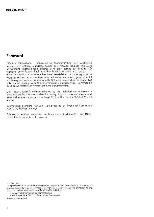 ISO 246:1995 is a standard published by the International Organization for Standardization (ISO). Its full title is "Rolling bearings — Cylindrical roller bearings, separate thrust collars — Boundary dimensions". This standard covers: Cancels and replaces the first edition (1978). Specifies the width, the maximum outside diameter, the bore and the bore minimum chamfer of separate thrust collars for cylindrical roller bearings in diameter series 2, 3 and 4 as specified in ISO 15.