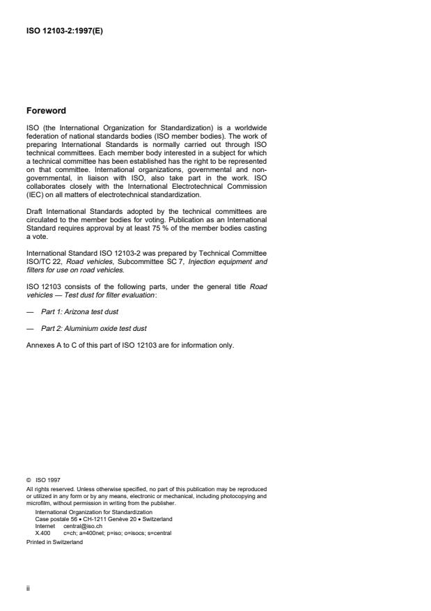 ISO 12103-2:1997 is a standard published by the International Organization for Standardization (ISO). Its full title is "Road vehicles - Test dust for filter evaluation - Part 2: Aluminium oxide test dust". This standard covers: Road vehicles - Test dust for filter evaluation - Part 2: Aluminium oxide test dust