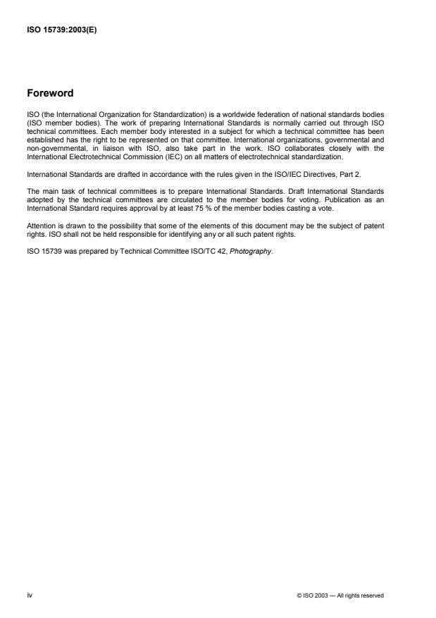 ISO 15739:2003 is a standard published by the International Organization for Standardization (ISO). Its full title is "Photography — Electronic still-picture imaging — Noise measurements". This standard covers: ISO 15739:2003 specifies methods for measuring and reporting the noise versus signal level and dynamic range of electronic still-picture cameras. It applies to both monochrome and colour electronic still-picture cameras.