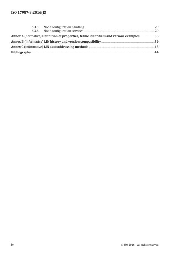 ISO 17987-3:2016 specifies the LIN protocol including the signal management, frame transfer, schedule table handling, task behaviour and status management and LIN master and slave node. It contains also OSI layer 5 properties according to ISO 14229‑7 UDSonLIN-based node configuration and identification services (SID: B016 to B816) belonging to the core protocol specification. A node (normally a master node) that is connected to more than one LIN network is handled by higher layers (i.e. the application) not within the scope of ISO 17987-3:2016.