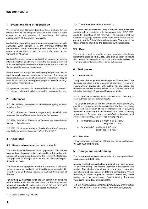 ISO 6914:1985 is a standard published by the International Organization for Standardization (ISO). Its full title is "Rubber, vulcanized — Determination of ageing characteristics by measurement of stress at a given elongation". This standard covers: Describes three methods of testing: A: measurements under continuous strain, B: preferred for intermittent strain, C: alternative to B under intermittent strain and laboratory conditions. For A and B a stress tester is used to record the stress at the temperature of ageing. Helpful for quality control. Measurement at differnt temperatures may be used for research. Method to be used depends on the purpose of test.