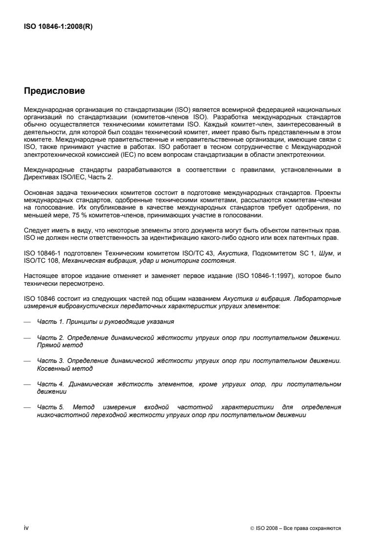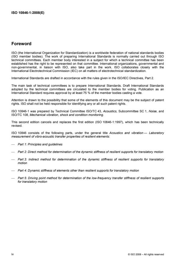 ISO 10846-1:2008 explains the principles underlying ISO 10846-2, ISO 10846-3, ISO 10846-4 and ISO 10846-5 for determining the transfer properties of resilient elements from laboratory measurements, and provides assistance in the selection of the appropriate part of this series. It is applicable to resilient elements that are used to reduce the transmission of audiofrequency vibrations (structure-borne sound, 20 Hz to 20 kHz) to a structure which may, for example, radiate fluid-borne sound (airborne, waterborne, or other), and the transmission of low-frequency vibrations (typically 1 Hz to 80 Hz), which may, for example, act upon human subjects or cause damage to structures of any size when the vibration is too severe.