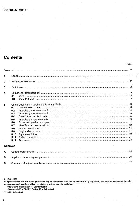 ISO 8613-5:1989 is a standard published by the International Organization for Standardization (ISO). Its full title is "Information processing — Text and office systems — Office Document Architecture (ODA) and interchange format — Part 5: Office Document Interchange Format (ODIF) (Provisionaly retained edition)". This standard covers: Information processing — Text and office systems — Office Document Architecture (ODA) and interchange format — Part 5: Office Document Interchange Format (ODIF) (Provisionaly retained edition)