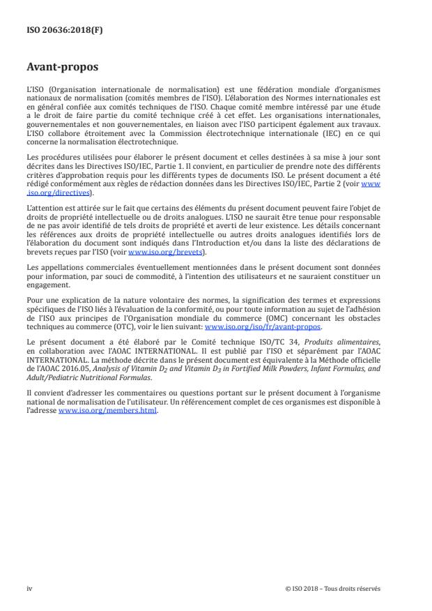 ISO 20636:2018 is a standard published by the International Organization for Standardization (ISO). Its full title is "Infant formula and adult nutritionals - Determination of vitamin D by liquid chromatography-mass spectrometry". This standard covers: This document specifies a method for the quantitative determination of vitamin D2 and/or vitamin D3 in infant formula, and adult nutritionals in solid (i.e. powders) or liquid (i.e. ready-to-feed liquids and liquid concentrates) forms using liquid chromatography-mass spectrometry. The application range runs from 0,15 µg/100 g (limit of quantification) to 59 µg/100 g for vitamin D2 and from 0,25 µg/100 g to 65 µg/100 g for vitamin D3.